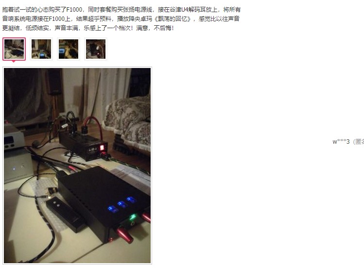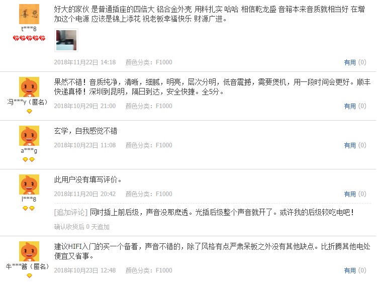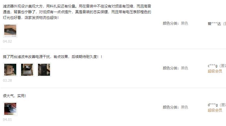 為了使欲購(gòu)F1000的愛(ài)好者們更好的了解F1000電源濾器,小編在這里整理了部分淘寶店鋪已經(jīng)購(gòu)買過(guò)的用戶的評(píng)價(jià),希望對(duì)大家選購(gòu)幫助!