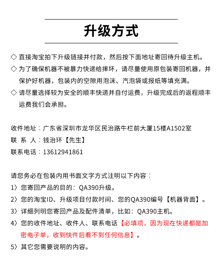 3〉所有朋友拍下訂單后,請在2天內(nèi)寄出您的QA390,晚收到的機器只能安排到下一個批次才能MOD。