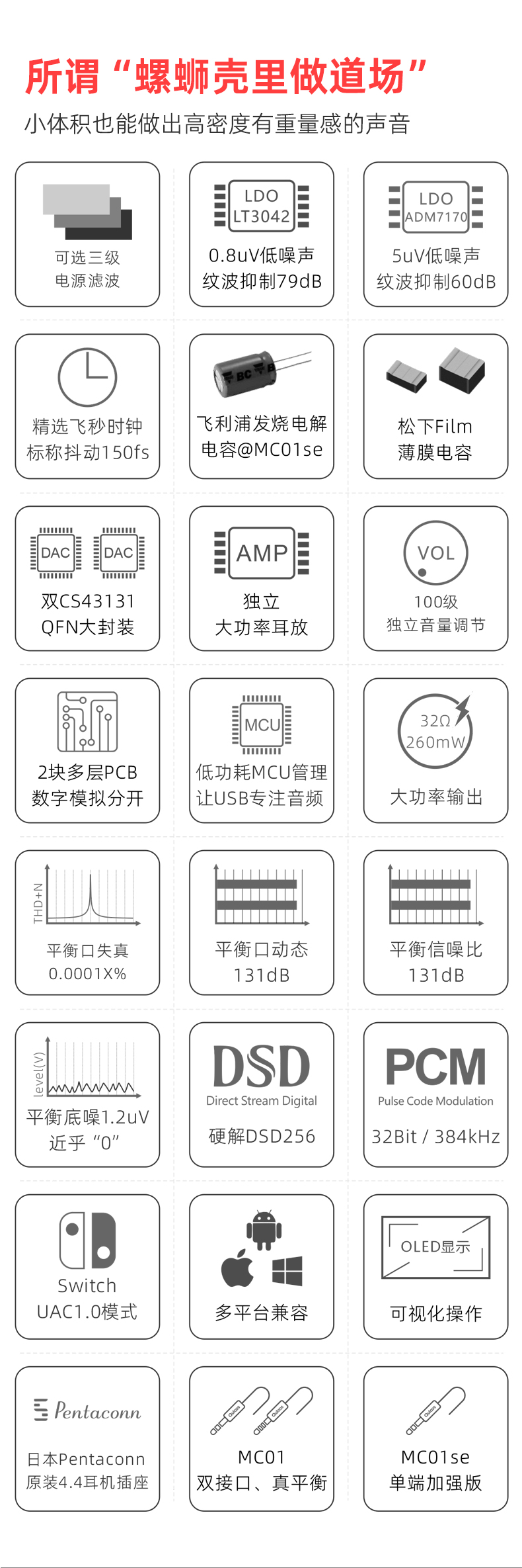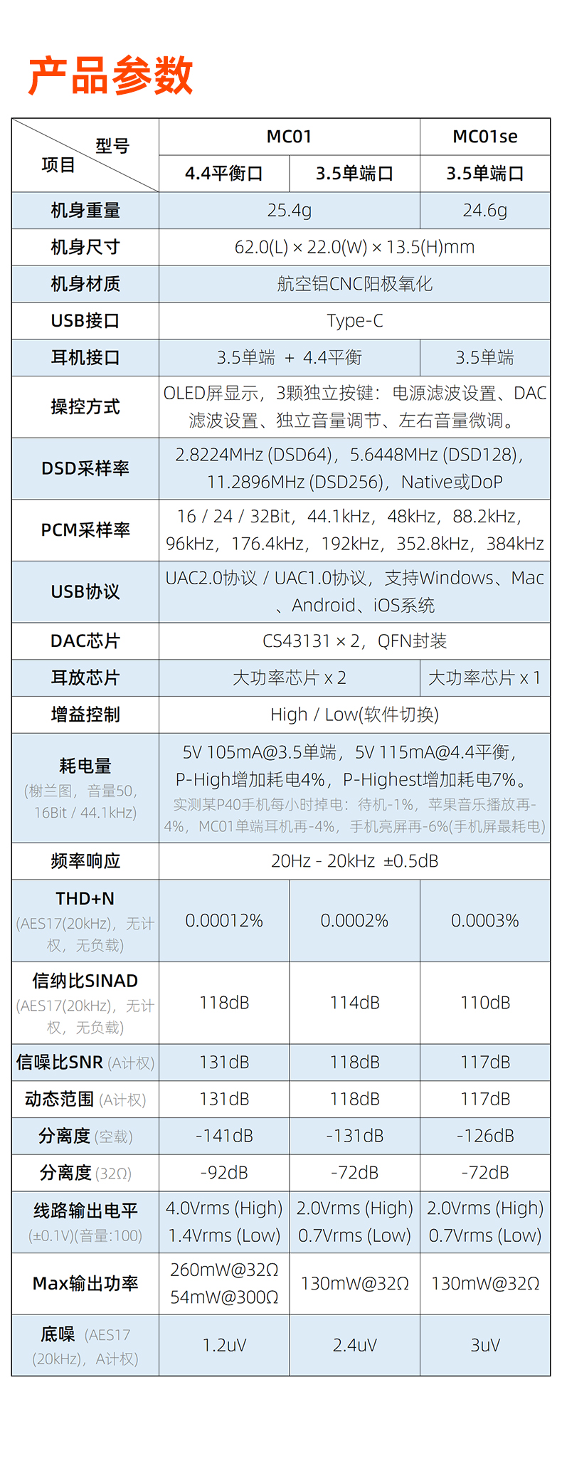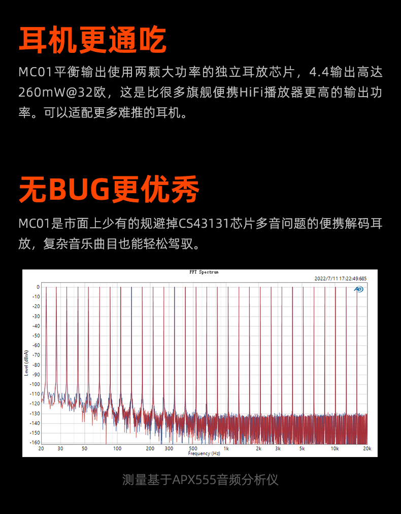 MC01平衡輸出使用兩顆大功率的獨(dú)立耳放芯片,4.4輸出高達(dá)260mW@32歐,這是比很多旗艦便攜HiFi播放器更高的輸出功率??梢赃m配更多難推的耳機(jī)。