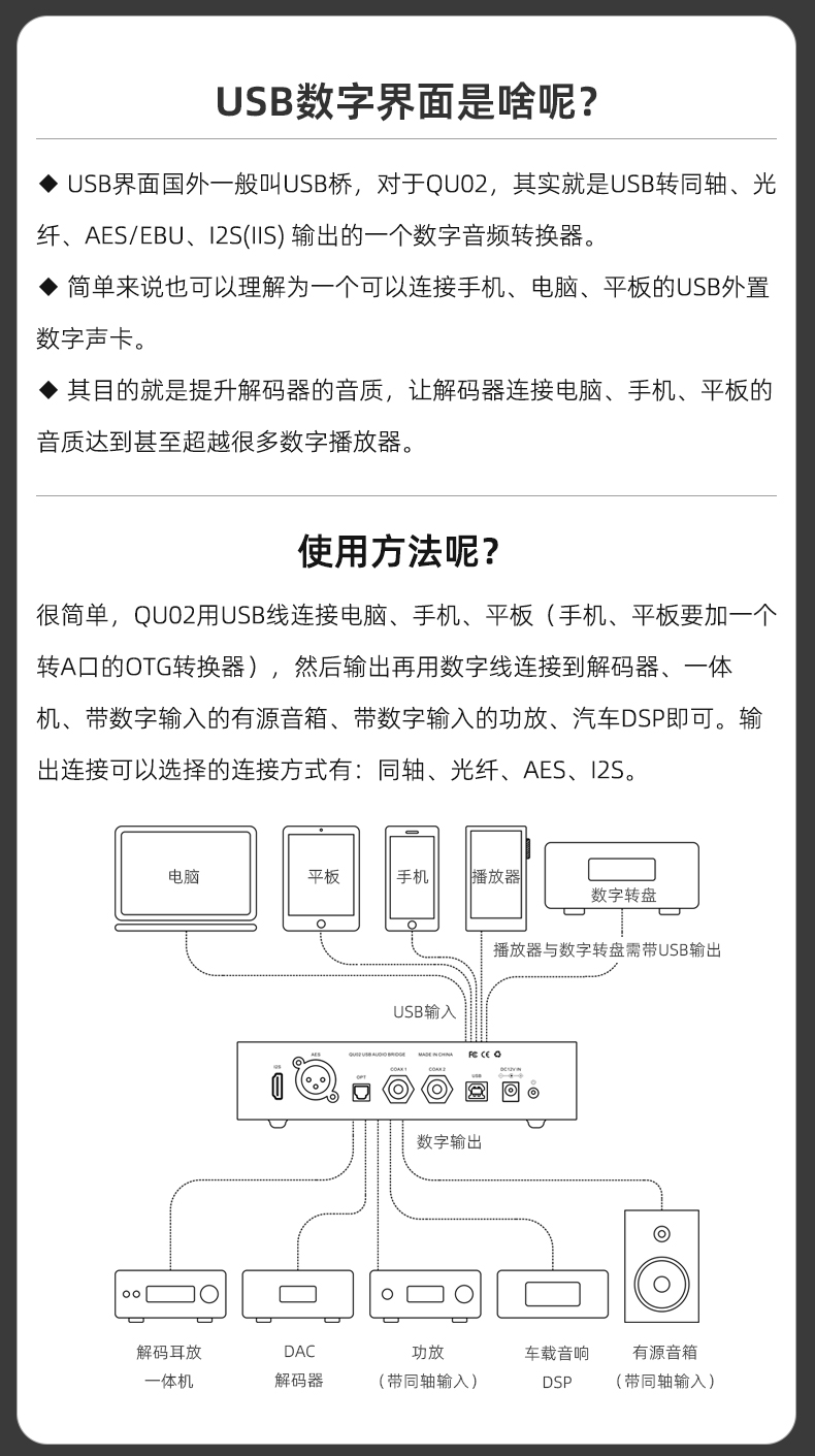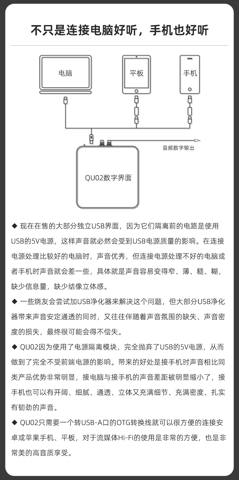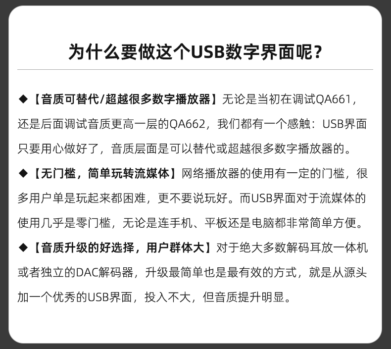 QA662是我們?cè)赒A661基礎(chǔ)上推出的全面升級(jí)換代產(chǎn)品。自QA661在2015年上市,2019年停產(chǎn)以來,QA662的研發(fā)歷時(shí)多年,成為乾龍盛的跳票王。在這漫長(zhǎng)的研發(fā)歲月中,我們不斷挑戰(zhàn)聲音上限,逐步打造出今天我們?yōu)橹院赖囊糍|(zhì)表現(xiàn)。QA662專注于提供純數(shù)字音頻輸出,沒有模擬輸出。我們的初衷是通過QA662提升用戶系統(tǒng)中數(shù)字音頻的輸出品質(zhì),從源頭保證音質(zhì)的上限。因此,QA662無法直接與耳放或模擬輸入功放相連,需要搭配DAC解碼器或其他支持?jǐn)?shù)字音頻輸入的設(shè)備協(xié)同工作。我們堅(jiān)信,正是由于QA662專注于數(shù)字音頻輸出的卓越性能,才能將數(shù)字音頻的品質(zhì)推向嶄新高度。