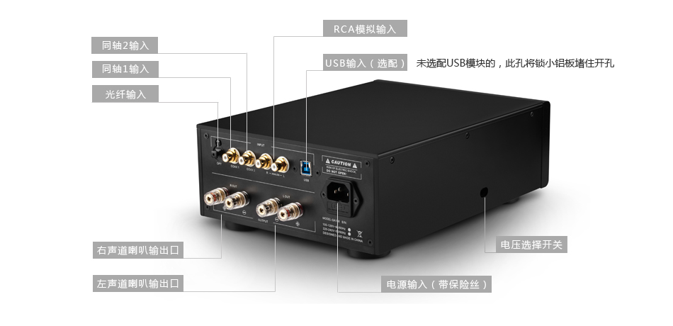 ◇ 數(shù)字輸入:光纖、同軸RCA x 2、模擬輸入、并可選配XMOS數(shù)字界面模塊使其具備USB輸入。