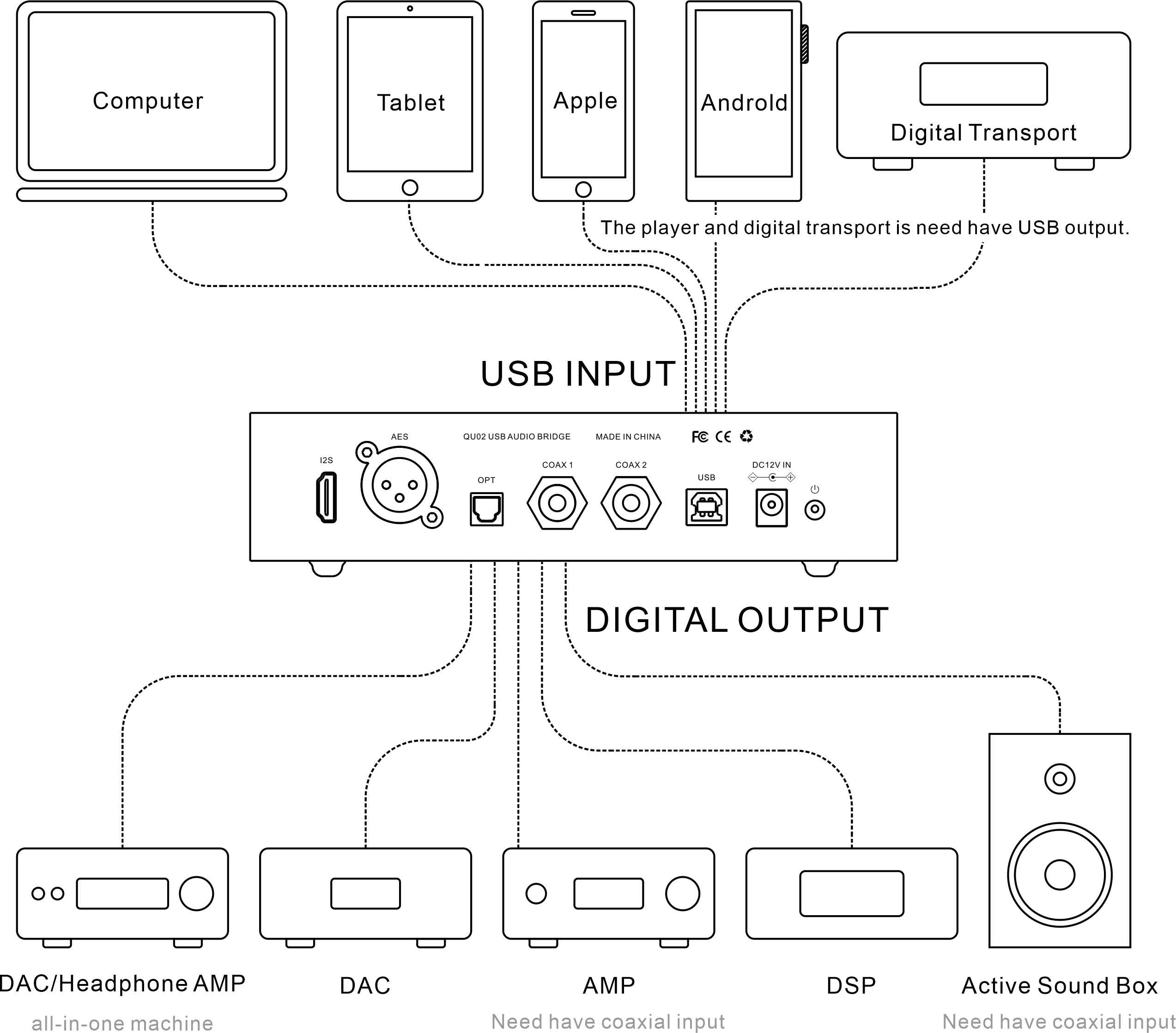 cable, and then output connect to DAC, active speakers
